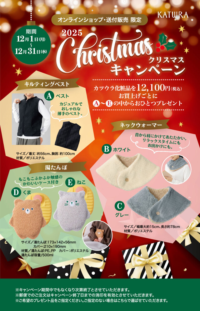 クリスマスキャンペーン 送付販売(電話・ファックス・ハガキでの注文)のキャンペーン期間は、2025年12月1日(月)~12月26日(金)です。ご注意ください。年末年始の商品の発送については、こちらをご確認ください⇒年末年始休業のお知らせ キャンペーン